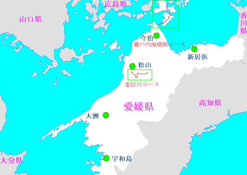 見たい地域をクリックして下さい。 未調査 ■瀬戸内海横断サイクリングコース ■重信川サイクリングコース