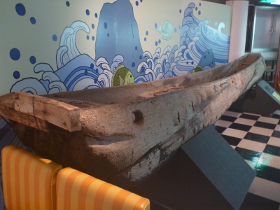 秋田市方向風景と八郎潟干拓前に使われていた丸木舟